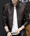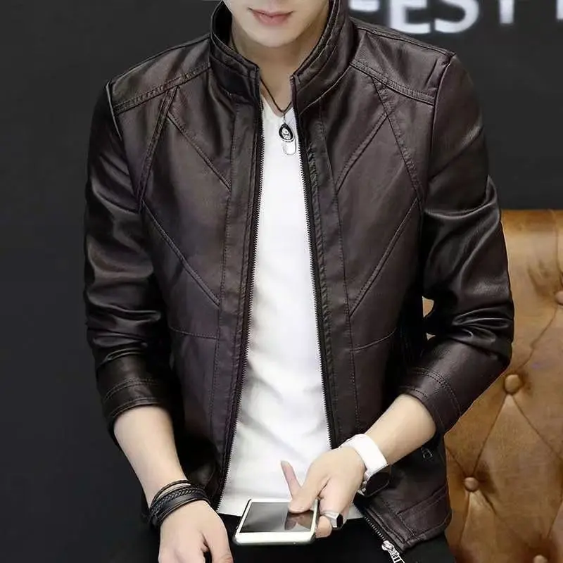 New Arrival Men’s Slim Fit Korean Style Leather Jacket with Stand Up Collar Thin Autumn Lined Coat for Middle Aged Young Men